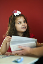 They work with flashcards with images depicting actions. Lucy's job is to match the card for "ball" with the card for "kick," for which she receives lots of praise and a small treat.