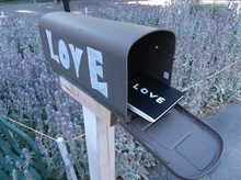 The mailboxes bear labels, "Grief" and "Love." Inside each is a journal and a pen. People are invited to write their thoughts about the subjects of grief and love.