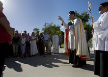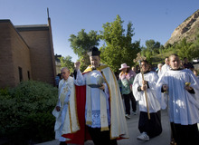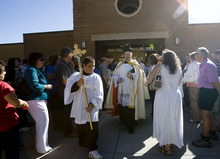 The Rev. Erik Richtsteig, right, leads a procession around St. James the Just Catholic Church in Ogden during a Mass of Reparation ceremony on June 20, 2013. The ceremony was scheduled to cleanse the church after James Evans was allegedly shot by his son-in-law Charles Richard Jennings Jr. during Mass on Sunday.