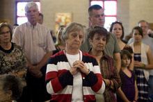 Alice Weil, left, prays at St. James the Just Catholic Church in Ogden during a Mass of Reparation ceremony on Thursday. The ceremony was scheduled to cleanse the church after James Evans was allegedly shot by his son-in-law Charles Richard Jennings Jr. during a church service last Sunday.