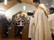 The Rev. Erik Richtsteig kneels at the alter during a procession at St. James the Just Catholic