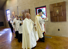 The Rev. Erik Richtsteig, right, leads a procession around the inside of St. James the Just Cat