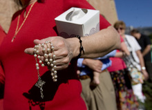 Sandy Conway holds a rosary during a procession outside St. James the Just Catholic Church in Ogden during a Mass of Reparation ceremony on June 20, 2013.  The ceremony was scheduled to cleanse the church after James Evans was allegedly shot by his son-in-law Charles Richard Jennings Jr. during Mass on Sunday. The Rev. Erik Richtsteig led a procession around the building and sanctuary while reciting prayers to cleanse the building.