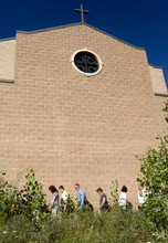Parishioners process around  St. James the Just Catholic Church in Ogden during a Mass of Reparation ceremony on June 20, 2013.  The ceremony was scheduled to cleanse the church after James Evans was allegedly shot by his son-in-law Charles Richard Jennings Jr. during Mass on Sunday. The Rev. Erik Richtsteig led a procession around the building and sanctuary while reciting prayers to cleanse the building.