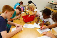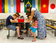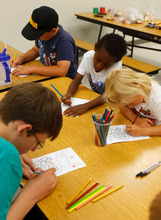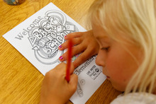 Kids color pages to go in a welcome kit for faculty and staff at Woodrow Wilson Elementary School in Salt Lake City, Thursday as part of United Way's Summer of Service.