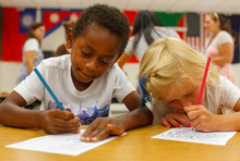 Eli and Isabelle Hill color pages to go in welcome kits for faculty and staff at Woodrow Wilson Elementary School in Salt Lake City, Thursday as part of United Way's Summer of Service.