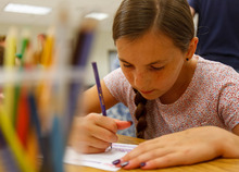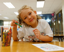 Isabelle Hill colors a page to go in a welcome kit for faculty and staff at Woodrow Wilson Elementary School in Salt Lake City, Thursday as part of United Way's Summer of Service.