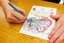 Isabelle Hill colors a page to go in a welcome kit for faculty and staff at Woodrow Wilson