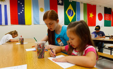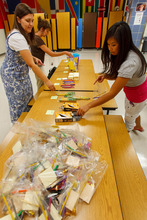 McKenzi and Maci Mitchell color pages to go in welcome kits for faculty and staff at Woodrow Wilson Elementary School in Salt Lake City, Thursday as part of United Way's Summer of Service.