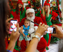 Lyric Padilla poses for a photo with Santa as the Salt Lake Board of Realtors held its annual Christmas in July event at The Road Home homeless shelter in Salt Lake City on Friday, July 12, 2013.