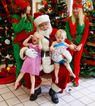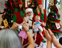 Elliana and Abigail Butterfield pose for a photo with Santa as the Salt Lake Board of Realtors held its annual Christmas in July event at The Road Home homeless shelter in Salt Lake City on Friday, July 12, 2013.
