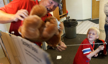 Nathan Stanley snags a stuffed bear in a fishing game run by volunteer Steve Critchfield as the Salt Lake Board of Realtors held its annual Christmas in July event at The Road Home homeless shelter in Salt Lake City on Friday, July 12, 2013.