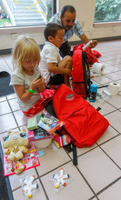 Paige Stanley, Andrew Bartholomew and Patrick Bartholomew look through the items in backpacks they were given as the Salt Lake Board of Realtors held its annual Christmas in July event at The Road Home homeless shelter in Salt Lake City on Friday, July 12, 2013.