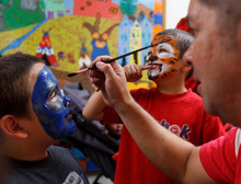 Leo Perez paints Christopher Aguilar's face as his brother Jonathan looks on as the Salt Lake Board of Realtors held its annual Christmas in July event at The Road Home homeless shelter in Salt Lake City on Friday, July 12, 2013.
