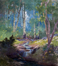 Hafen's Parisian training in impressionistic art is evident in "The Mountain Stream." The edges of the peaceful scene painted in muted greens are less defined in the foreground; the more detailed images of trees in the background "bring the eye backwards," noted the museum's associate director, Natalie Petersen.