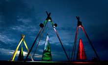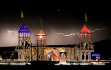 Large and complex electric lighting sits atop "mutant vehicles," cars turned into creatures that crawl the desert sand and rocks day and night, most playing music.