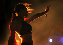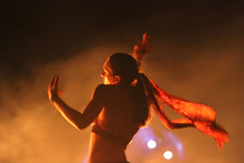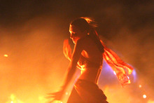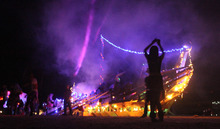 Members of the Pineapple Camp ignite the end of a burning spear and throw it into the center of the skeleton ship. Pyrotechnics ignite. Blinding flashes of white light pierce the darkness. The wind sends the spear's flame to the front of the ship, it meets with more fuel, and the ship begins its fiery end.