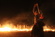 As the flames danced and embers blew north, Sound looks on from the front of the gathered circle of people. "It's got the wind at its back now," he says. "It's sailing."