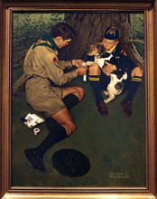 "Friend in Need" 1947 - Norman Rockwell. An illustration for the 1949 Brown & Bigelow Calendar. "American Originals: Norman Rockwell and Scouting" features 23 original works of art by Norman Rockwell at the LDS Church History Museum. Original artwork in the exhibit draws from a collection of paintings used for Boy Scout calendars and covers of Boys' Life magazine, Thursday, July 18, 2013.