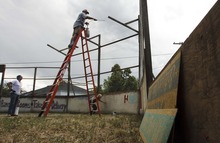 At The Sandlot, Evans pointed to the new backstop, a careful recreation of the original, designed and rebuilt by a Hollywood production designer.