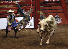 Riding despite a sore knee, DeMoss was thrown just a fraction before completing his eight-second ride.