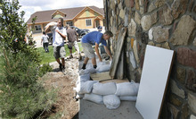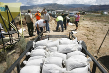 The Iron County Search and Rescue building on Cedar City's west side near the airport had sandbags available for residents. A sheriff's officer was at the site on Sunday supervising prisoners from the jail who were summoned to help fill the bags.
