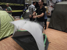 At the Outdoor Retailers Summer Market in the Salt Palace, Eli Resnik from Lightspeed Outdoors of San Diego demonstrated -- over and over again -- how fast the Bahia Quick Draw mini-shelter can open and close. Oddly enough, he didn't seem bored by this.