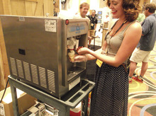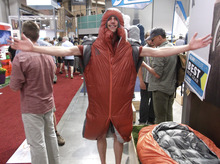 One thing that always draws a crowd at the Outdoor Retailers Summer Market at the Salt Palace: Free food. Here, Jaechon Anderson, at the Darn Tough Vermont booth, was handing out soft-serve ice-cream cones with bacon bits on top.