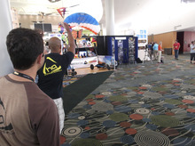 Chris Shultz (left) and Kevin Wade, from HQ Kites & Designs USA of Powells Point, N.C., have fun playing Crossboccia -- sort of a beanbag version of bocce -- at their booth at the Outdoor Retailers Summer Market in the Salt Palace. The two hazards of playing the game in a convention hall: The risk of hitting passing conventioneers, and the occasional small child making off with the beanbags.