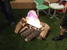 Want to emulate the outdoors in a cavernous convention hall? The JanSport booth at the Outdoor Retailer Summer Market at the Salt Palace resorted to an artificial campfire on fake turf.