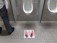 Some companies will advertise anywhere -- even the men's room -- at the Outdoor Retailers Summer Market at the Salt Palace.