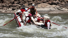 Holiday River guide Julian Springer points the raft straight into a hole as Carol McWilliam and Bob Hollingsworth brace for impact while navigating the rapids of Cataract Canyon in July 2012.