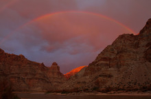 A double rainbow and epic morning light greet the river party for the last day of a float down Cataract Canyon before entering Lake Powell in July 2012.
