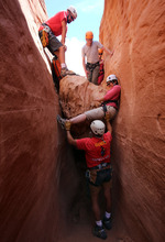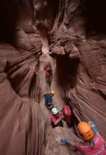 Moving slow is the name of the game as the group navigates a slot canyon in the Grand Staircase-Escalante National Monument so as to avoid a twisted ankle or worse.