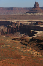 Mountain bikers ride the White Rim trail in Canyonlands National Park toward Candlest
