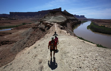 Hikers return to their mountain bikes after visiting the Fort Bottom ruins along the Green River along the White Rim Trail in Canyonlands National Park in May 2013.