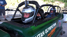 Salt Lake Tribune writer Brett Prettyman, back of the bobsled, preapres for his summer bobsled ride at Utah Olympic Park in June 2012. The aerial ski lessons and bobsled rides are part of The Utah Bucket List show airing on KUED-Channel 7 in August. Courtesy KUED