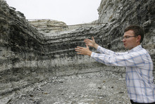 Mining engineer Ben France of Enefit American Oil points out black streaks undulating horizontally across the walls of his "box cut" into what geologists call "the mahogany zone," dark rock rich in kerogen, a precursor to liquid petroleum locked in shale.