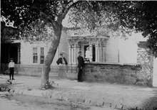 A home of Lorenzo Snow, fifth president of the LDS Church. The little boy is not identified, but the lady behind the picket fence was Mrs. J.O. Duke. the man was L.T. Peirce, a Brigham City merchant, and the little girl on the stone wall was Eleanor Duke.