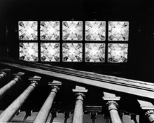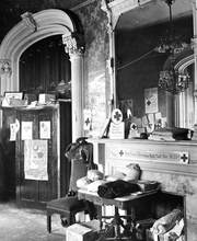 Interior of the home of Alfred William McCune in Salt Lake City. The home, located on north Main Street, cost $500,000 to build in 1901. McCune was a very successful business man with ventures in railroad and mining. He was a partner in the Peruvian Cerro de Pasco mines along with J. P. Morgan, William Randolph Hearst, and Frederick William Vanderbilt. McCune wanted his home to be extravagant. The McCune home site was chosen to rise up impressively over the nearby streets, and little expense was spared on decoration. McCune had materials shipped from San Domingo, England and South Africa. The red roof tiles came from Holland, and an enormous broad mirror wall was transported from Germany in a specially made railroad car. The walls were adorned with moiré silks, tapestries, and Russian leather. The exterior of the home was built of red Utah sandstone although some details like the lavish fireplaces used more exotic stone like Nubian marble.