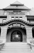 Exterior of the home of Alfred William McCune in Salt Lake City. The home, located on north Main Street, cost $500,000 to build in 1901. McCune was a very successful business man with ventures in railroad and mining. He was a partner in the Peruvian Cerro de Pasco mines along with J. P. Morgan, William Randolph Hearst, and Frederick William Vanderbilt. McCune wanted his home to be extravagant. The McCune home site was chosen to rise up impressively over the nearby streets, and little expense was spared on decoration. McCune had materials shipped from San Domingo, England and South Africa. The red roof tiles came from Holland, and an enormous broad mirror wall was transported from Germany in a specially made railroad car. The walls were adorned with moiré silks, tapestries, and Russian leather. The exterior of the home was built of red Utah sandstone although some details like the lavish fireplaces used more exotic stone like Nubian marble.