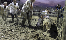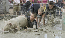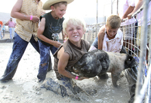 Team "Muddy Buddies" members Kolton Bennett, Aidan Goates, Easton McDonald and Carter Jones try to tackle a pig and put it in a barrel in the fastest time during the Utah County Fair pig wrestling competition at the Spanish Fork Fairgrounds August 14, 2013. The Utah County Fair runs through Saturday.