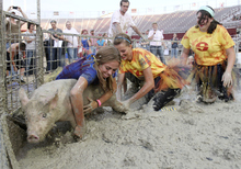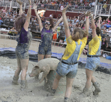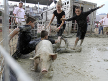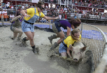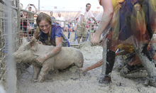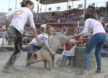 Lacey Hjorth and the "Dirty Devils," made up of Springville High FFA members (Taelor Craudell, Katelynn Axford, and Andalyn Hall) try to tackle a pig and put it in a barrel in the fastest time during the Utah County Fair pig wrestling competition at the Spanish Fork Fairgrounds August 14, 2013. The Utah County Fair runs through Saturday.
