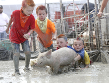 Team "Bacon-ators" members Radi Stafford, Eli Stafford, Tai Nui White and Mia Legas try to tackle a pig and put it in a barrel in the fastest time during the Utah County Fair pig wrestling competition at the Spanish Fork Fairgrounds August 14, 2013. The Utah County Fair runs through Saturday.