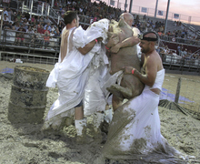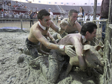 Team "Pig 'N Dales" members Jason, Jacob, Justin and Kyle Rawle try to tackle a p