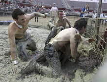 Team "Call of the Wildmen" members Cole Sorensen, Cinch Sorensen, Tate Sorensen and Garrett Smith try to tackle a pig and put it in a barrel in the fastest time during the Utah County Fair pig wrestling competition at the Spanish Fork Fairgrounds August 14, 2013. The Utah County Fair runs through Saturday.