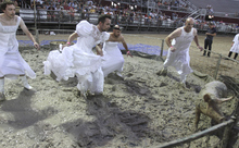 Team "Pearls Before Swine" members Justin Sandberg, Tommy Parish, Joey Parish and Craig Hansen, wearing wedding gowns, try to tackle a pig and put it in a barrel in the fastest time during the Utah County Fair pig wrestling competition at the Spanish Fork Fairgrounds August 14, 2013. The Utah County Fair runs through Saturday.