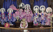 Priests offer vegetarian food to the deities at the altar. Believers say Krishna is a single god who can be incarnated in many forms, called deities.