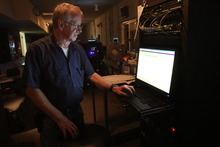 In the booth • Redwood projectionist Earl Shafer hauled reels and manned projectors for 40 years. That ended this summer when the Redwood switched to digital. Shafer now runs the drive-in's four digital screens down from six with a few commands on a keyboard and 165-megabyte hard drives.
