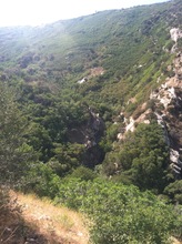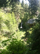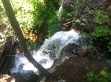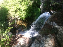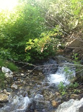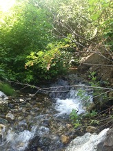 The hike begins with pretty steep climb that's exposed to the sun don't forget the block! After about a half-mile, it drops into the canyon and continues along the creek, criss-crossed by several fun log bridges. There's even a swing that someone set up a while back with a rope and a plastic seat. The trail begins to climb again in about half-mile or so, ending in a pretty waterfall. Be careful on the way back it's occasionally easy to lose your way, but not too hard to find the trail again.